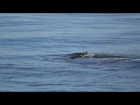 This whale was logging at the surface, which means it was sitting there and not moving. Resting, or a form of sleeping, but just coming up and down to breathe. I like how the blowhole is small for the exhale and larger for the inhale, and then a little water comes in at the end.